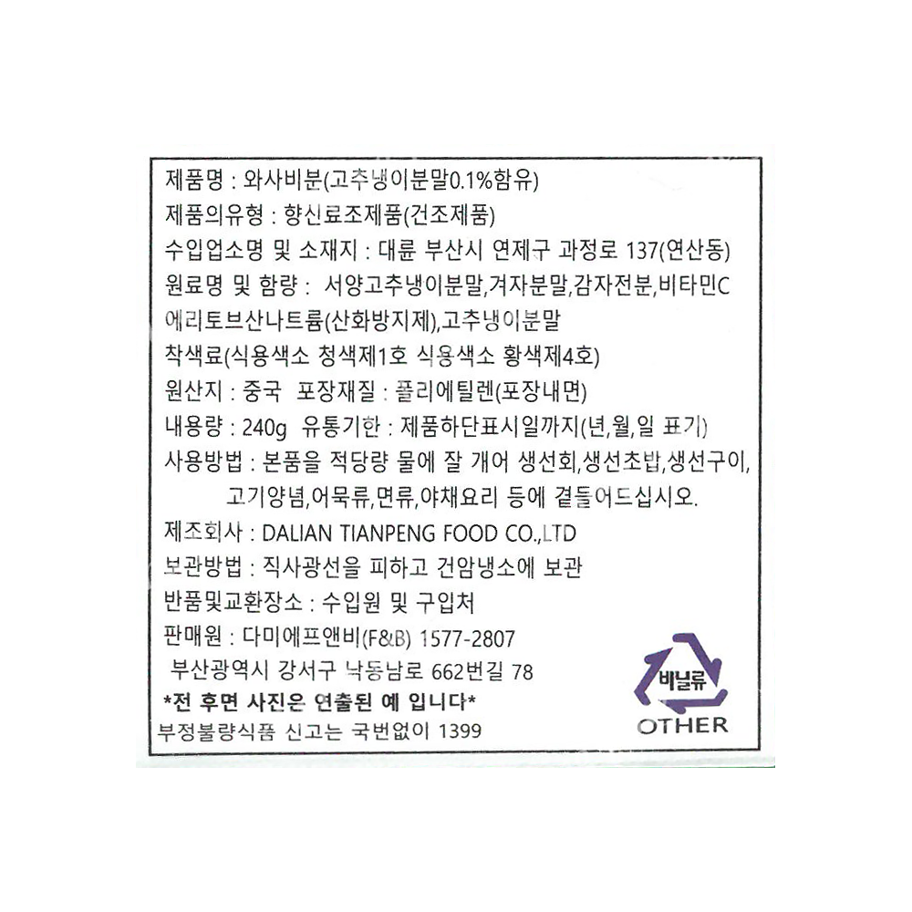 | 상품명 | 와사비(분,이구치,240g) | 식품유형 | 상세설명참조 |