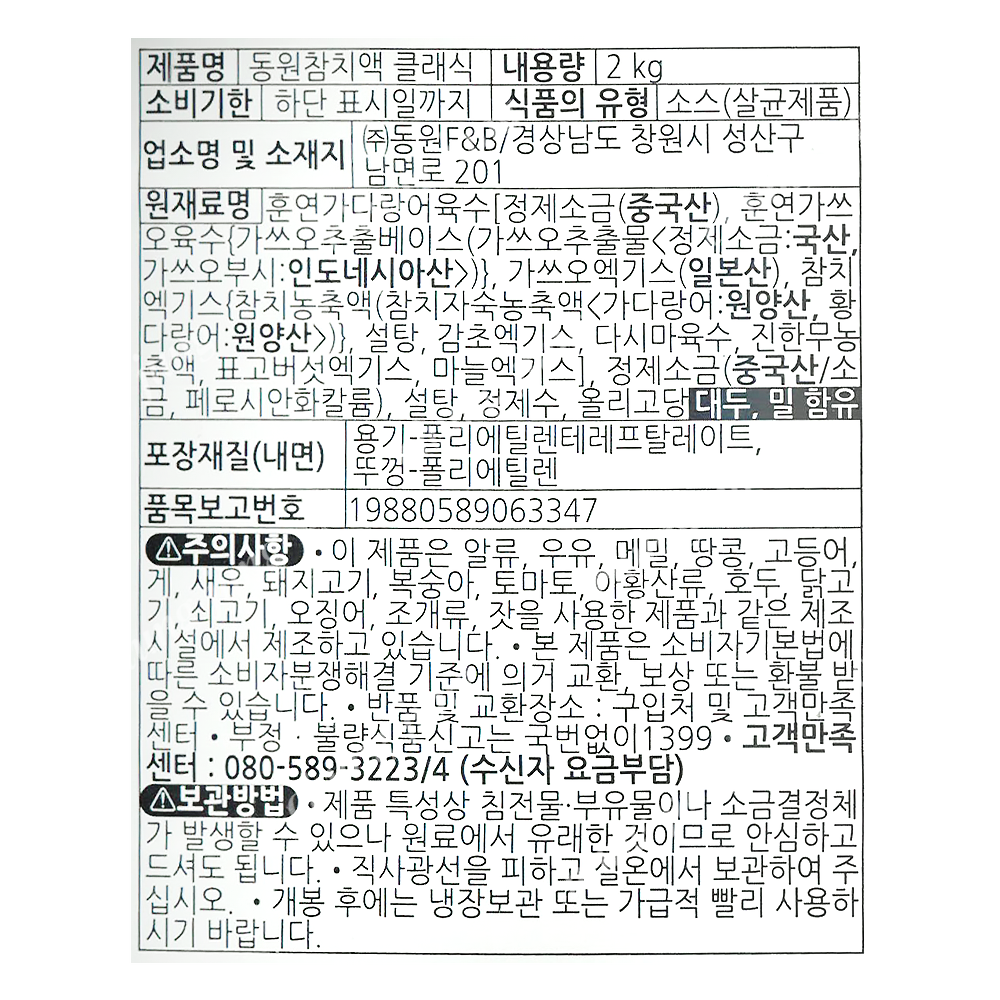 | 상품명 | 참치액(클래식,동원,2kg) | 식품유형 | 상세설명참조 |