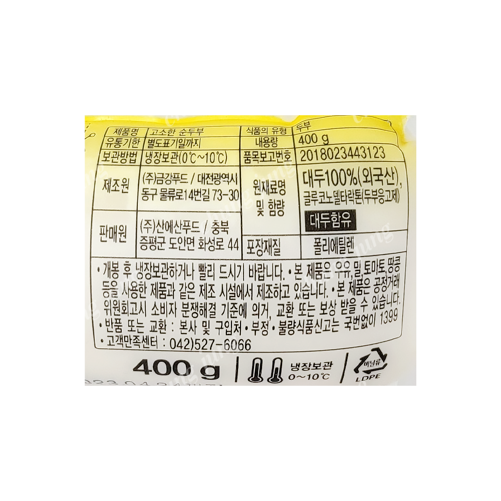 | 상품명 | 순두부(고소한,산에산푸드,400g) | 식품유형 | 상세설명참조 |
