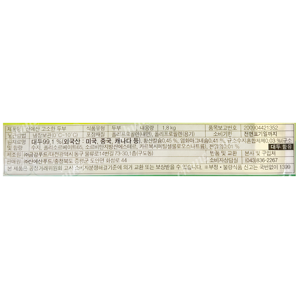 | 상품명 | 두부(고소한,산에산푸드,1.8kg) | 식품유형 | 상세설명참조 |