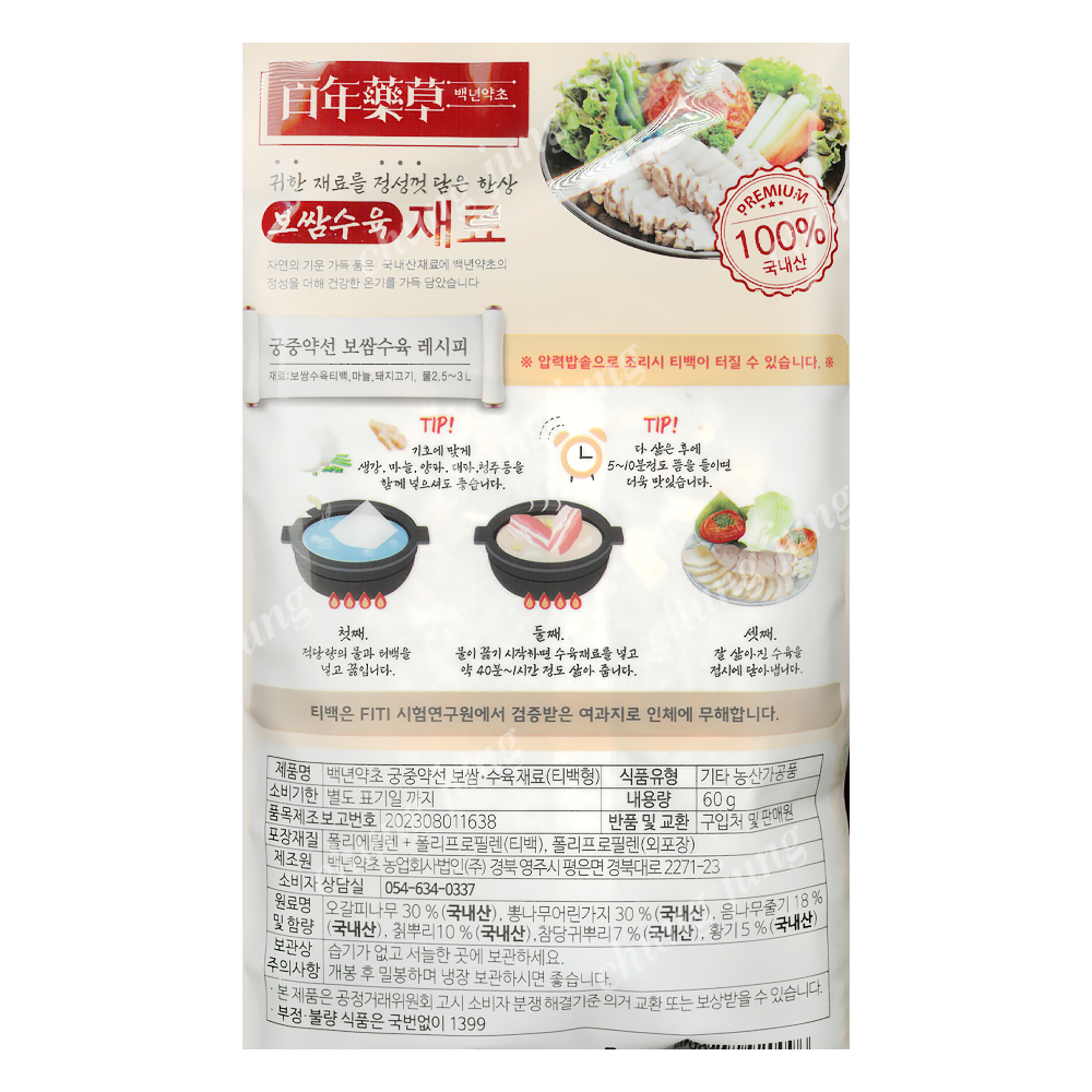 | 상품명 | 보쌈수육재료(궁중약선,백년약초,60g,국내산) | 식품유형 | 상세설명참조 |