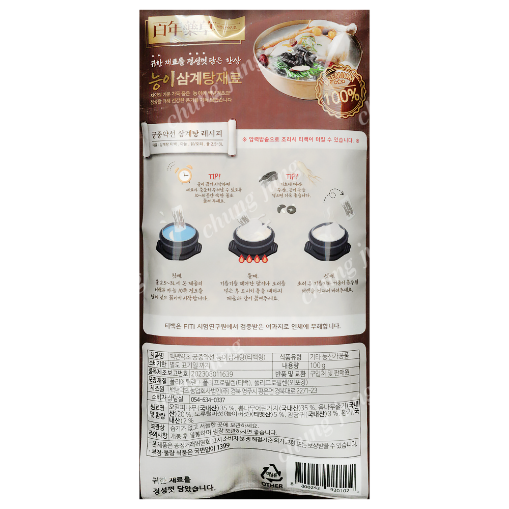 | 상품명 | 삼계탕재료(궁중약선(능이),백년약초,100g) | 식품유형 | 상세설명참조 |