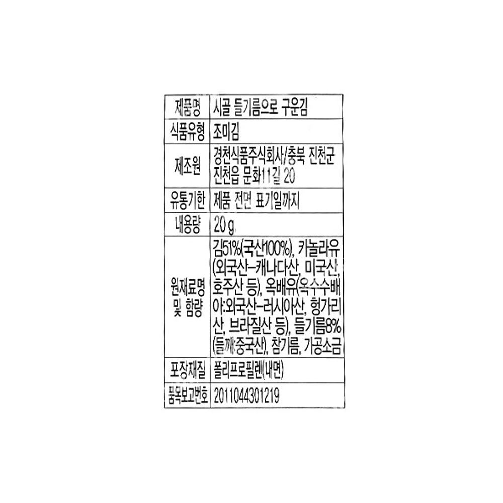 | 상품명 | 김(들기름으로구운시골,20g*3) | 식품유형 | 상세설명참조 |