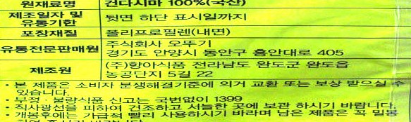 | 생산자및소재지(수입품의경우 생산자,수입자 및 제조국) | 상세설명참조 | 제조연월일,유통기한또는품질유지기한 | 상품입고시 마다 제조일이 상이하여 유통기한이 다릅니다.배송되는 상품은 선입선출에 의해 출고되오니 안심하고 구입하시기 바랍니다. 유통기한에 대한 궁금하신사항은 문의글이나 전화를 주시면 상세히 안내해 드리겠습니다. |
