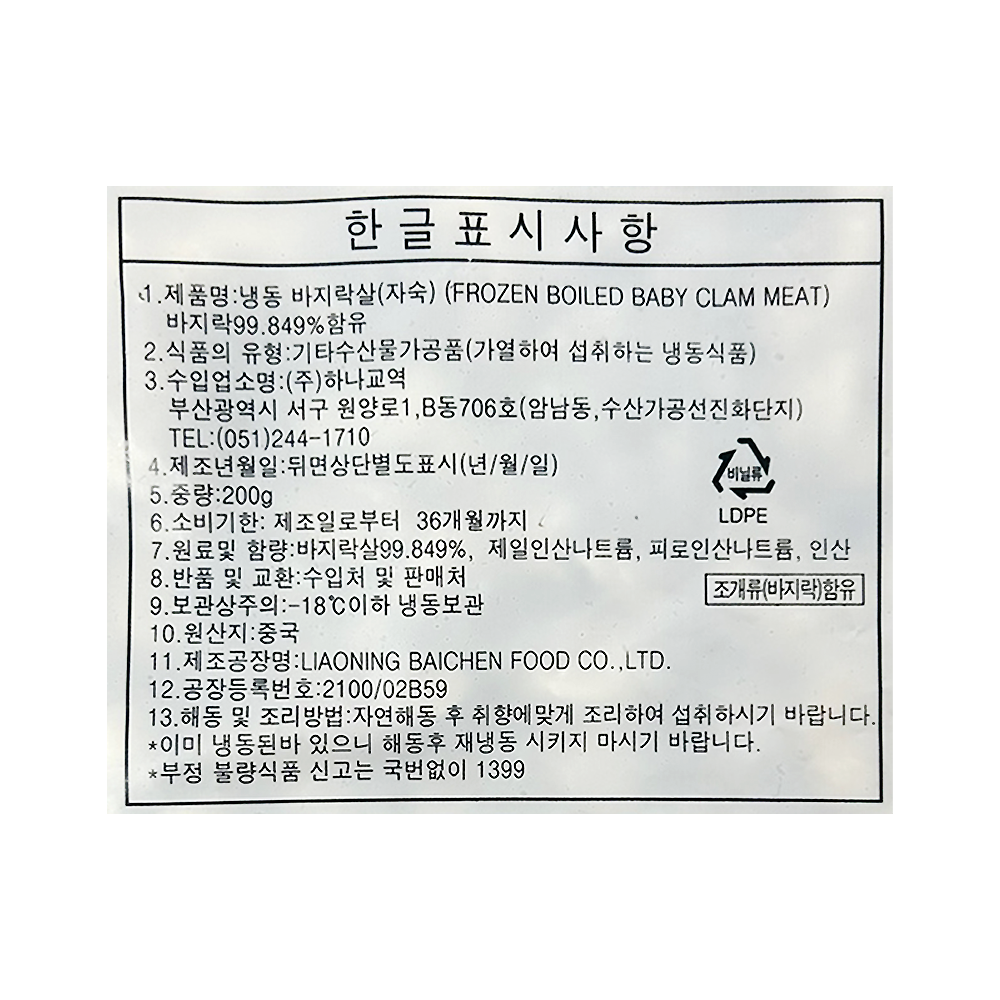 | 상품명 | 수/바지락살(자숙)100-200,200g | 식품유형 | 상세설명참조 |