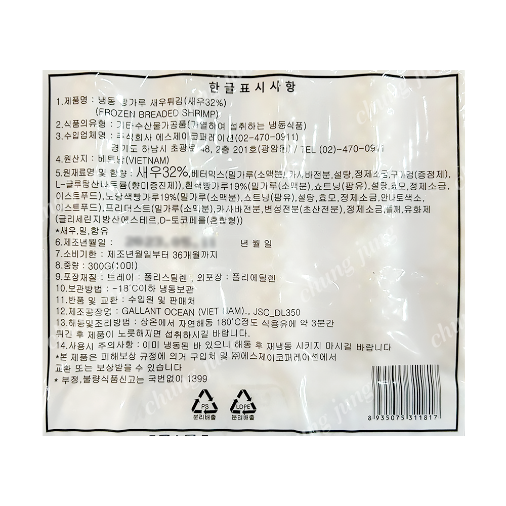 | 상품명 | 수/빵가루새우(30g*10미) | 식품유형 | 상세설명참조 |