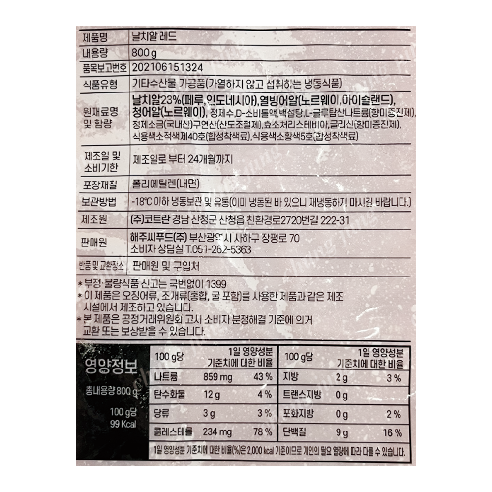 | 상품명 | 수/날치알(레드,바다왕,800g) | 식품유형 | 상세설명참조 |