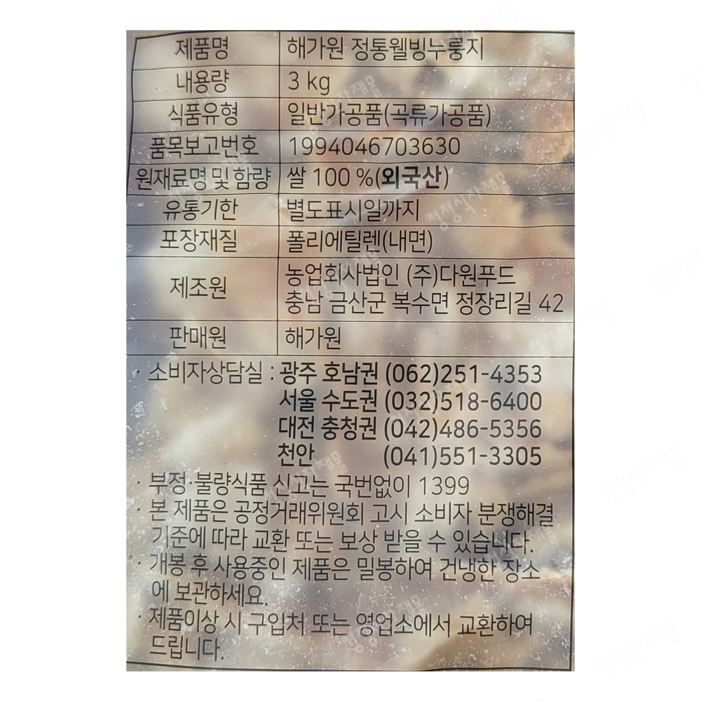 | 상품명 | 누룽지(웰빙,해가원,3kg) | 식품유형 | 상세설명참조 |