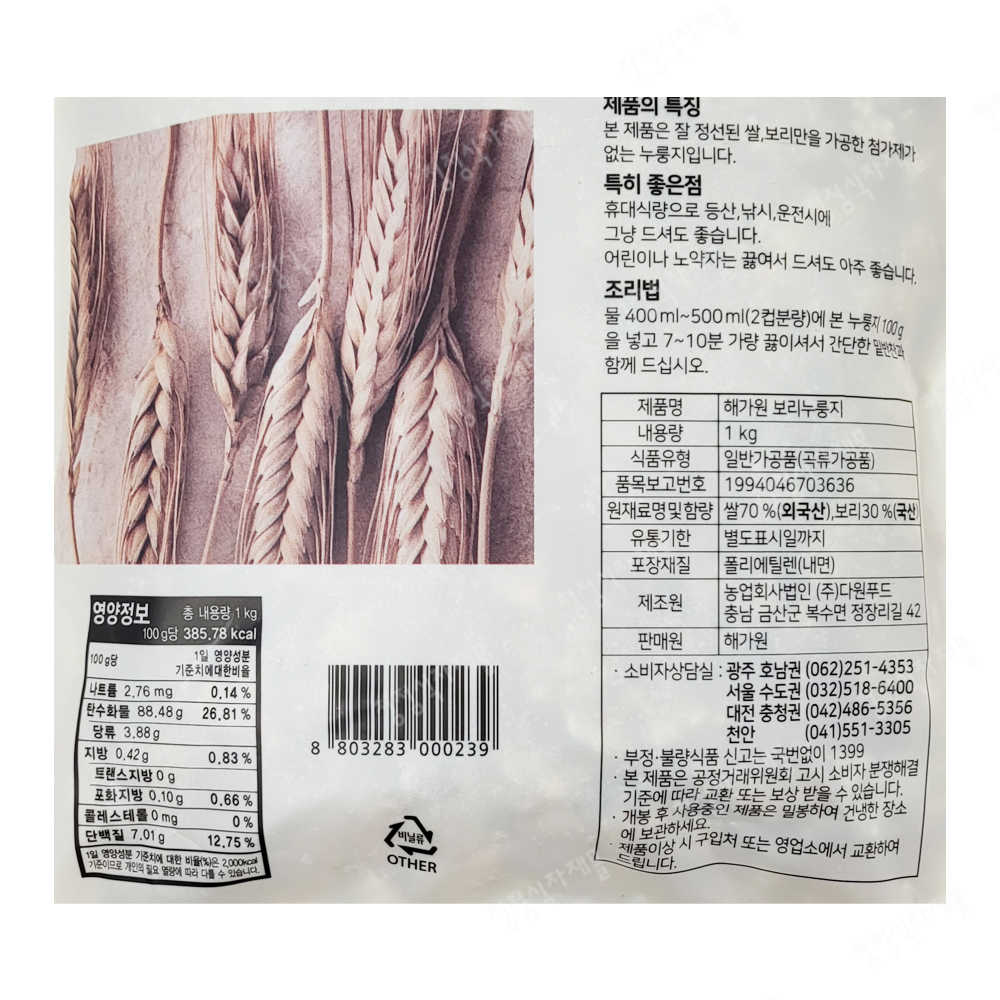 | 상품명 | 누룽지(보리,해가원.1kg) | 식품유형 | 상세설명참조 |