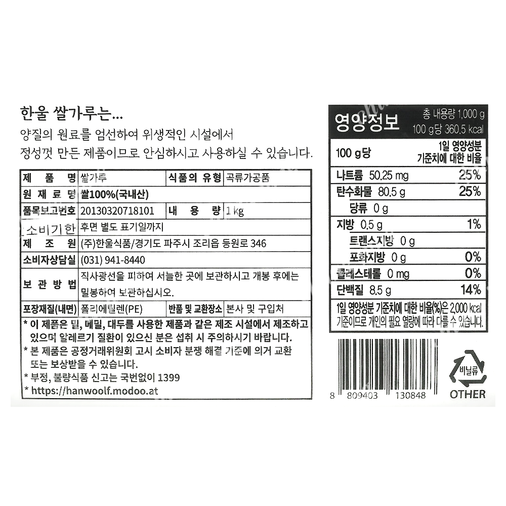 | 상품명 | 쌀가루(국산100%,한울,1kg) | 식품유형 | 상세설명참조 |