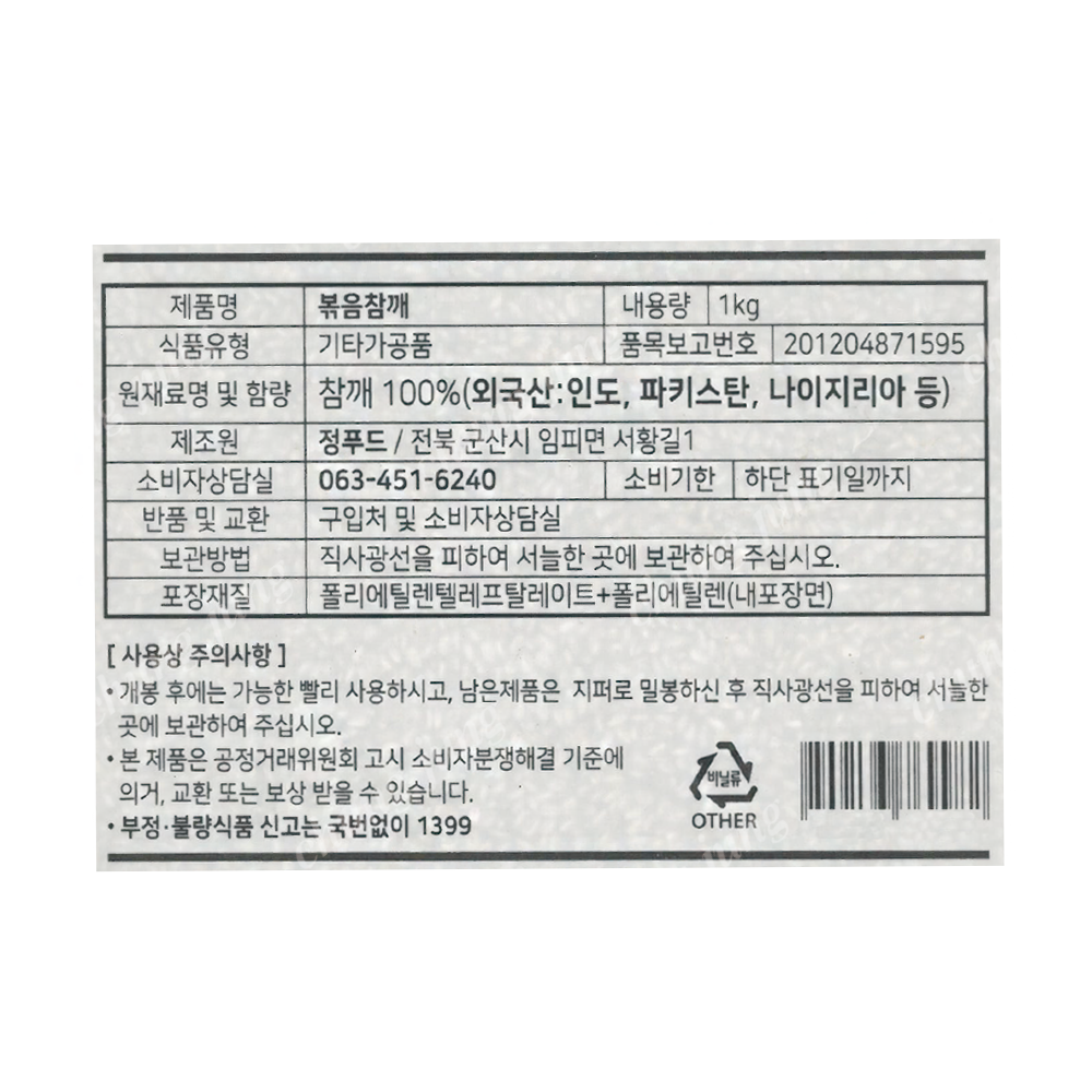 | 상품명 | 볶음참깨(함깨해요,수입산,1kg) | 식품유형 | 상세설명참조 |