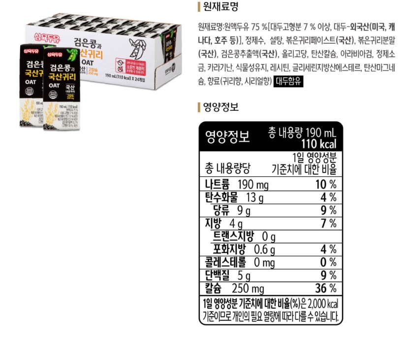 | 상품명 | 두유(검은콩국산귀리,삼육,190ml*24입) | 식품유형 | 상세설명참조 |