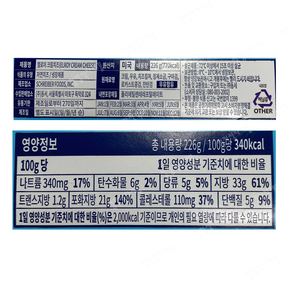 | 상품명 | 크림치즈(엘로이,동서,226g) | 식품유형 | 상세설명참조 |