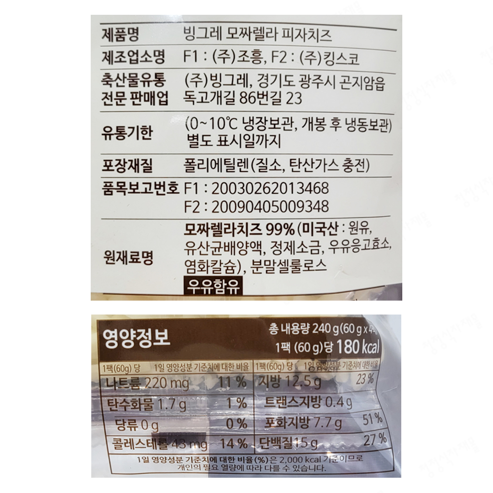 | 상품명 | PYA/치즈(모짜렐라피자,빙그레,60g*4) | 식품유형 | 상세설명참조 |