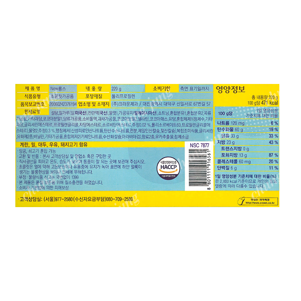 | 상품명 | 과자(롱스,크라운,220g) | 식품유형 | 상세설명참조 |