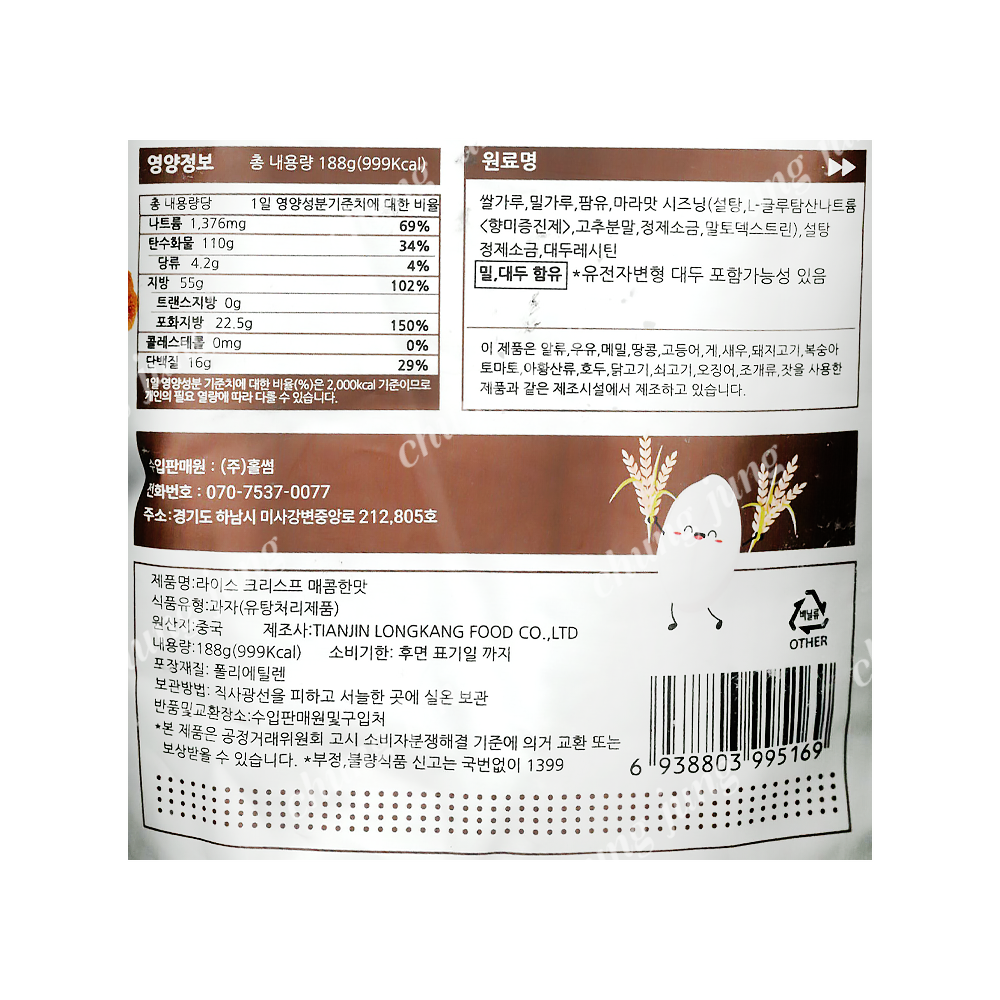 | 상품명 | 과자(라이스크리스프,매콤한,188g) | 식품유형 | 상세설명참조 |