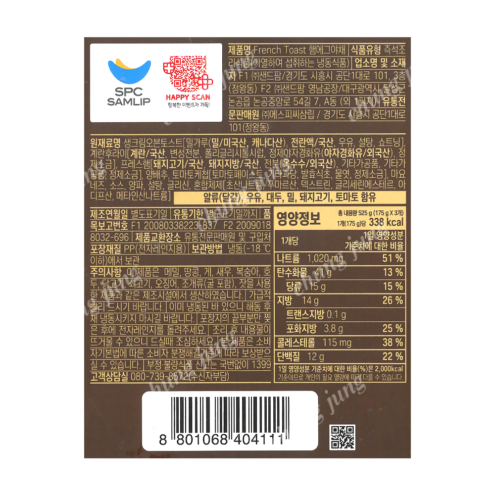 | 상품명 | 냉동빵(햄에그야채토스트,삼립,525g) | 식품유형 | 상세설명참조 |