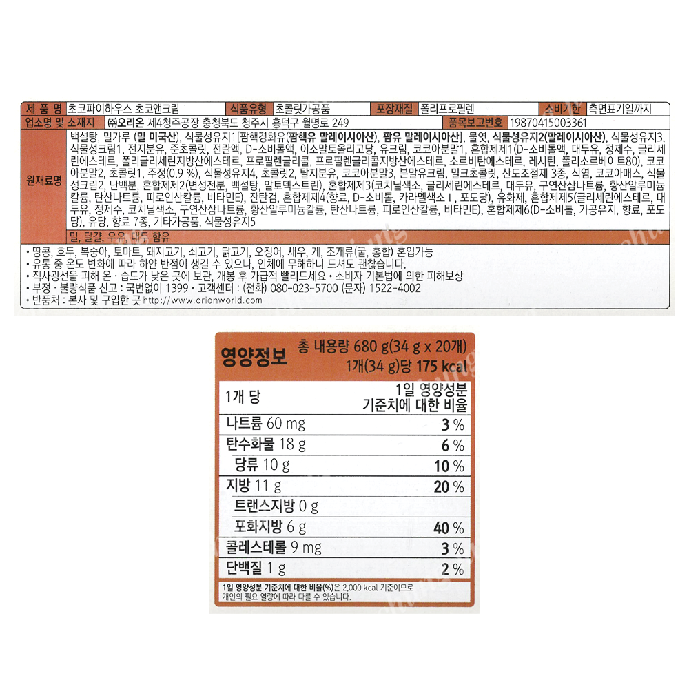 | 상품명 | 과자(초코파이초코앤크림,오리온,20p) | 식품유형 | 상세설명참조 |