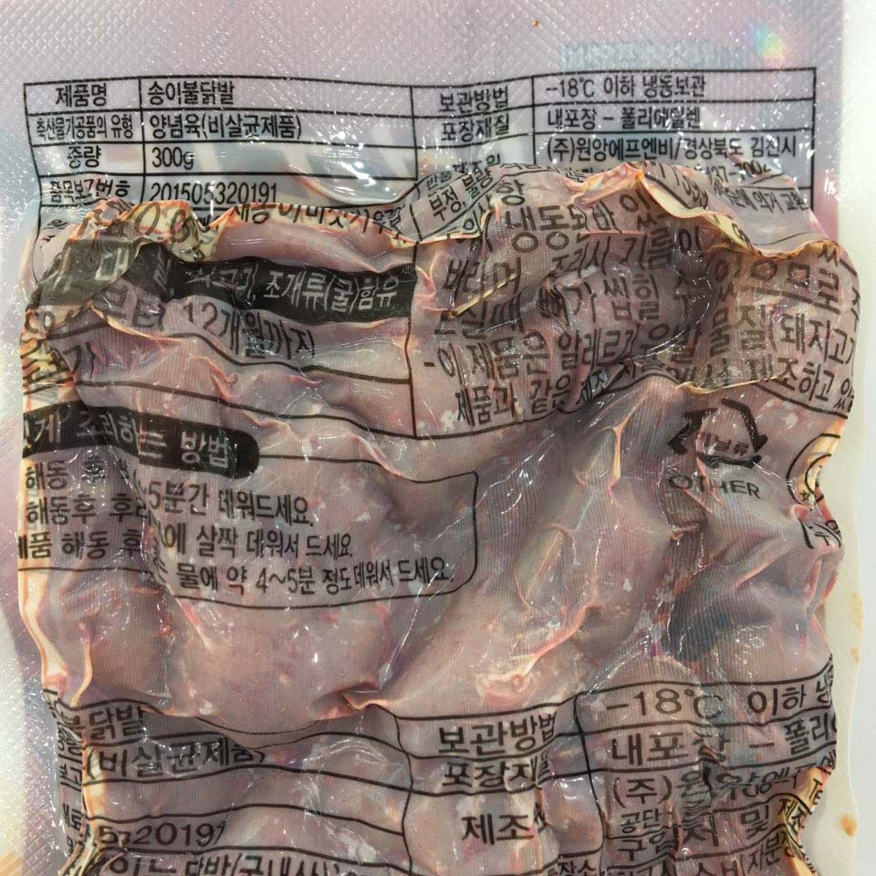 | 포장단위별 용량(중량),수량 | 300g | 원재료명 및 함량 | 닭발(국내산,87%) |