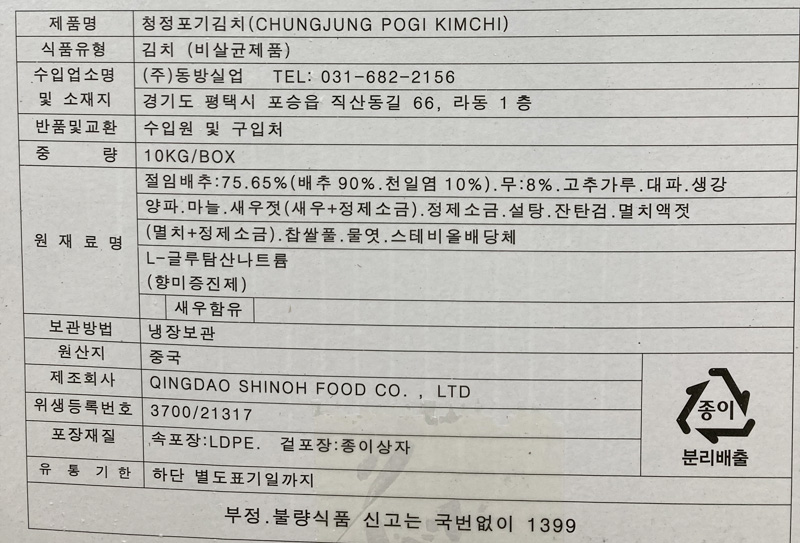 | 상품명 | 김치(포기,청정(신),중국산,10kg) | 식품유형 | 상세설명참조 |