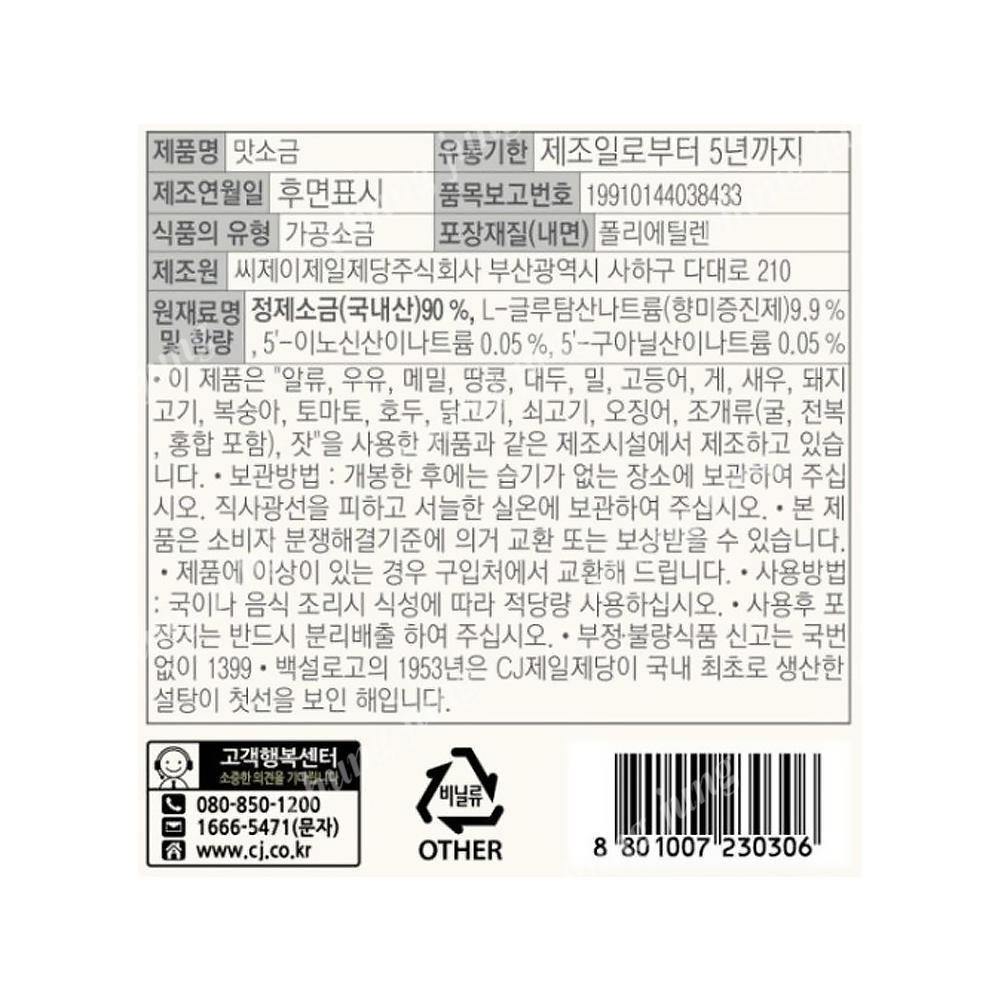| 상품명 | 백설맛소금250g | 식품유형 | 상세설명참조 |