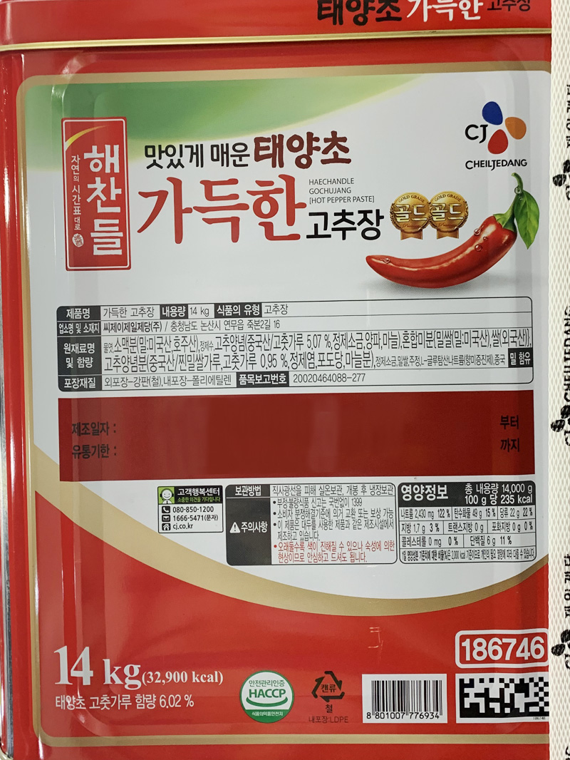 | 상품명 | 고추장(가득찬,해찬들,14kg) | 식품유형 | 상세설명참조 |