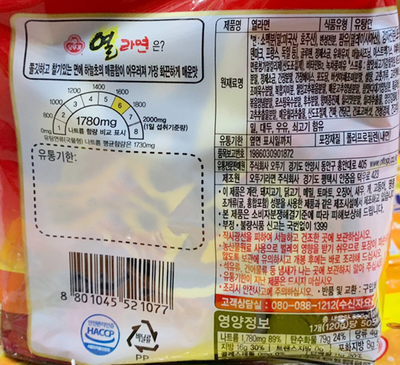| 상품명 | 라면(열라면,오뚜기,120g*5입) | 식품유형 | 상세설명참조 |