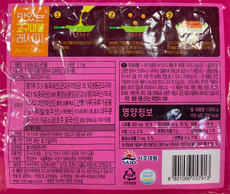 | 상품명 | 라이스 찰고구마볼1Kg | 식품유형 | 상세설명참조 |