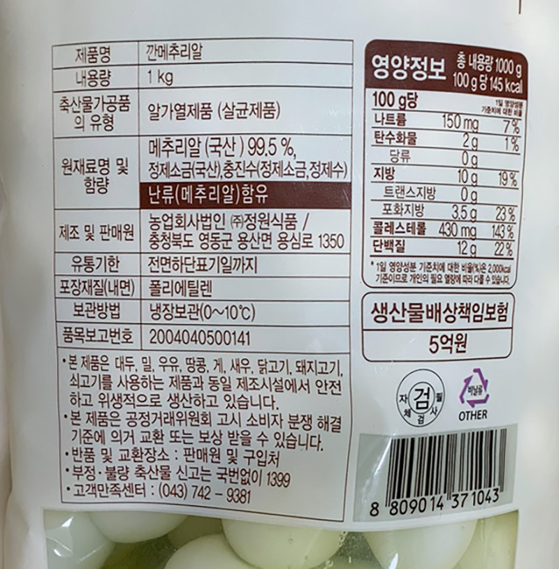 | 상품명 | 깐메추리알(정원,1kg) | 식품유형 | 상세설명참조 |