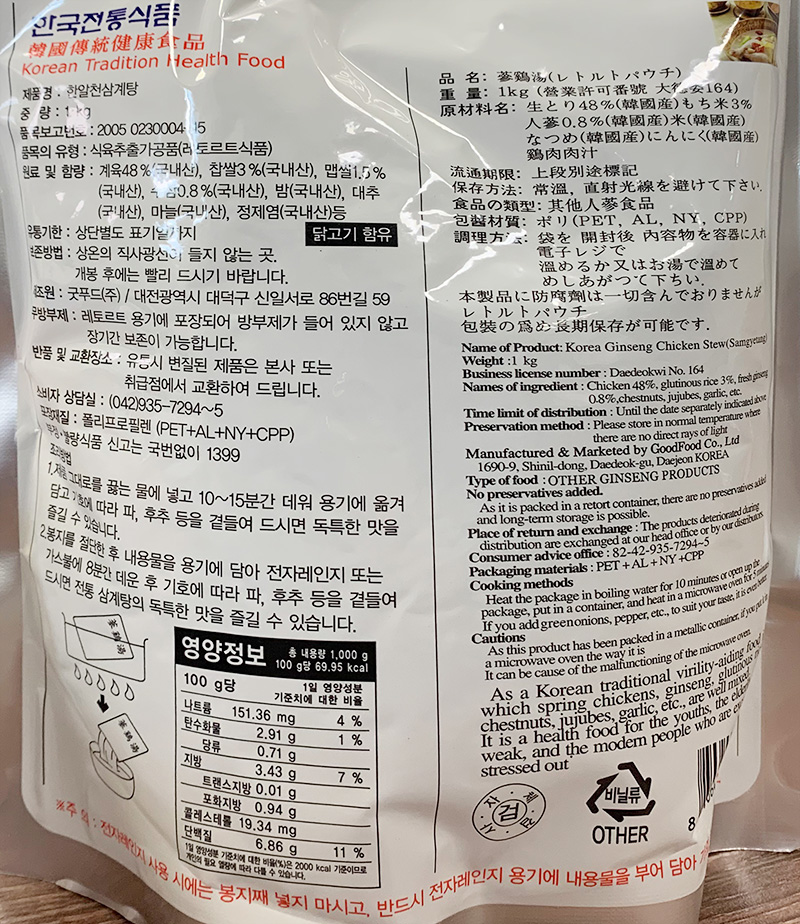 | 상품명 | 삼계탕(한알천,1kg) | 식품유형 | 상세설명참조 |