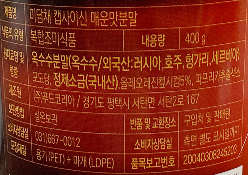 | 상품명 | 캡사이신(분말,미담채,400g) | 식품유형 | 상세설명참조 |
